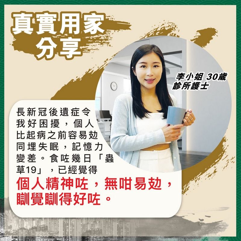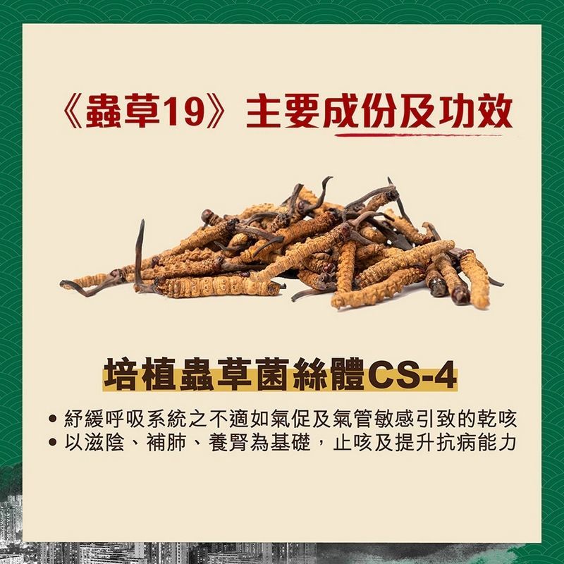 蟲草大王 - 蟲草19 供應商再度返多10000盒, 全城do姐價😍 蟲草大王《蟲草19》60粒裝 🔸有效紓緩長新冠及感冒後主要症狀 優點: 有效紓緩以下長新冠及感冒後主要症狀: 。紓緩持續氣促、乾咳、喉嚨乾痕 。消除極度疲倦感 。提升免疫力及改善失眠問題 。增強肺部及呼吸系統健康 📍培植蟲草菌絲體CS-4 。紓緩呼吸系統不適 紓緩上呼吸道之不適如氣促及氣管敏感引致的乾咳。 📍姬松茸 。提升免疫力及改善失眠問題 含豐富蛋白質、多醣體及維他命,有助健腦益腎,更可養心安神,使入睡更佳。 📍魚腥草,綠茶素 。消除極度疲倦感 魚腥草具抑菌功效;綠茶素具有強勁清除自由基,並有效消除疲勞感。 使用方法: 口服,每日1-2次, 每次2粒,飯後服 成分組合: 培植蟲草CS-4、黃芪、酸棗仁、姬松茸、魚腥草、綠茶素、鐵皮石斛、硬脂酸鎂 (防凝劑) 儲存方式 請存放於陰涼乾燥處,避免雪藏及陽光直射。 請注意 由於內含成分屬天然,因此產品之顏色略有深淺