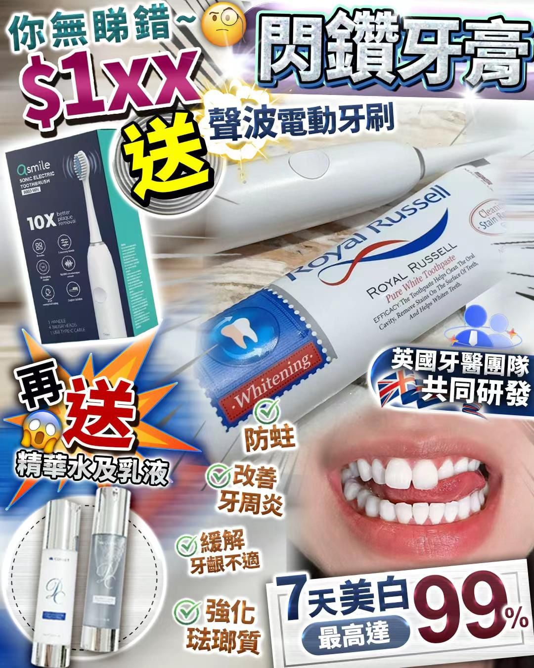 Christmas set F. 白牙過聖誕套裝 (包括閃鑽牙膏x1 聲波震動牙刷x1 ) 每套加送精華水及乳液 預計下星期到貨 嘩 供應商派福利😍😍 $189 牙膏送聲波震動牙刷 😱😱 全年最荀就係呢次🤭🤭 F . 白牙過聖誕套裝 閃鑽牙膏x 1 贈品 送 asmile 無線 聲波電動牙刷 x 1 含4個牙刷頭 (每套再加送 精華水及乳液各1支 ) 準備過一個白牙聖誕 🎄 你有冇覺得牙齒🦷一唔小心就黃晒?😣😣 以前嘅我都係咁架 🤭 笑嘅時候怕黃黚黚嚇親人 如果你好似我咁要追求白雪雪嘅牙齒 😬😬 由英國 German Dental Clinic 頂尖牙醫專家團隊研發嘅 #閃鑽牙膏 絕對係你嘅不二之選 呢支 #閃鑽牙膏 自從用咗這個牙膏,真係好勁!只係7天,你就會見到明顯嘅效果 🔻閃鑽牙膏 ✨核心防蛀成分,能強化牙釉質,抵抗酸蝕能抑制細菌生長,降低細菌產酸能力 ✨能與牙齒表面的色素、牙結石中的鈣離子絡合,幫助溶解和去除色素 ✨具有抗炎、舒緩作用,有助於緩解牙齦不適 ✨強化牙齒 固定住牙釉 質表面的鈣離子,使牙齒「再礦化」 🔻無線聲波電動牙刷 x 1 (含4刷頭) 新一代專業口腔護理。 英國 asmlie 聲波震動牙刷 結合精密設計與先進音波科技,向屋企都享受到牙醫級護牙體驗 * 6大專業潔齒模式「清潔 ·溫和·美白 ·拋光 ·按摩 ·敏感 」 * 每種模式3段強度選擇 * 高達56000次/分鐘 聲波震動 * 18檔智能模式