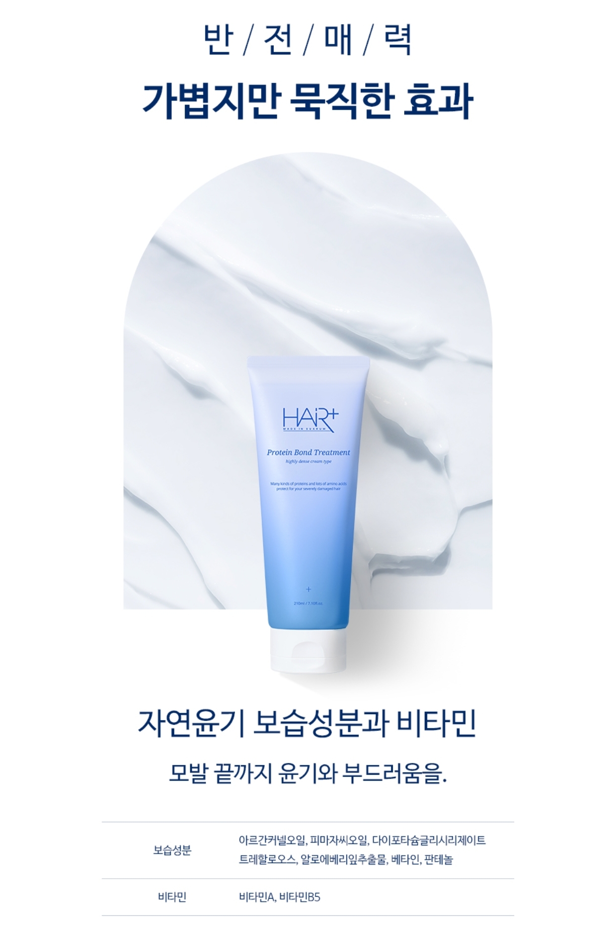 HAIR+ Hair Plus Protein Bond Treatment採用 Gel Cream Formulation 輕盈凝露質地,輕盈滑順,如雪花般融化於髮絲,為髮絲深層填充微蛋白,迅速吸收不油膩。 多種蛋白質成分與植物性保濕成分,針對化學性 (染燙、漂染、造型劑使用)、物理性(熱工具、 摩擦刺激)與環境性(乾燥氣候、水質、紫外線) 等多重傷害,提供集中的蛋白質養護。 多層次緻密營養配方 深層修護,多重蛋白質(微/小/蛋白質),達至頭髮深處 高效保濕,鎖水潤澤使髮絲更加柔順有光澤 性感香氛,馥郁迷人 雙重蛋白安瓶營養配方 小分子蛋白質,可深入髮芯修護,快速滲透後較易流失。 大分子蛋白質,強化包覆力,深度鎖留養分,適 用於極度受損髮質術後維護。 LPP + PPT = LPT,合力打造安瓶級密集營養。