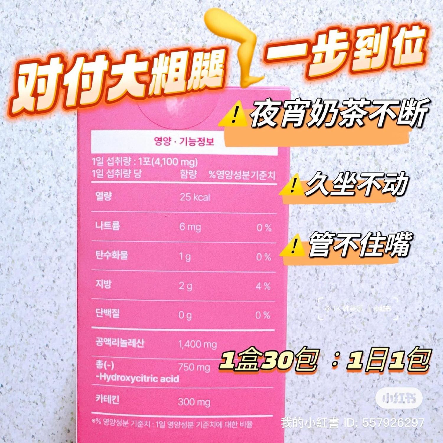韓國沒有胖oni 的秘密:甩肉肉趁現在 🔥 姐妹們 【Moadama 瘦身包】救星來啦~ 如果你有這些狀況: ✅久坐黨 ✅管不住嘴 ✅贅肉多 ✅易胖體質 ✅產後肥胖 ✅頑固肥胖 🩷身上肉肉多真的要早點安排上! 🩷都是純植物提取成分變瘦沒負擔 🩷綠茶提取物可抑制碳水化合物合成幫助減少體脂肪 🩷還能抗氧化、改善血液中膽固醇 🩷早美早享受~逆襲擁有好身材,衣服隨便穿 🩷想瘦更快的姐妹,可以再搭配運動 主要成分: HCA藤黃果提取物: 🔴抑制脂肪形成,燃燒脂肪刺激中樞神經 🔴有飽滿感,不容易餓,抑制食慾 🔴多種維他命:促進新陳代 🔴幫助身體所需營養,有活力持續瘦身減少脂肪 🔴再也不用餓著減肥,健康的瘦身 CLA共軛亞油酸: 🔴臨床研究報告都證明,共軛也油酸在脂肪控制上卓越表現有促進脂肪的分解 🔴抑制脂肪細胞的生成,增加肌肉質量 如何服用: 1日1次,1次1包 飯後吃【需要大量攝取充足水份哦】 ⚠️注意事項: ①嬰幼兒、兒童、孕婦及哺乳期婦女請勿食用 ②患有肝、腎、心臟疾病者、過敏及哮喘者或正在服藥者請咨詢專家 #韓國正品 #減肥 #減脂 #moadamda #韓國瘦身 #瘦身包30日 #減肥減脂吃這些 #減肥瘦肚子 #減內臟脂肪