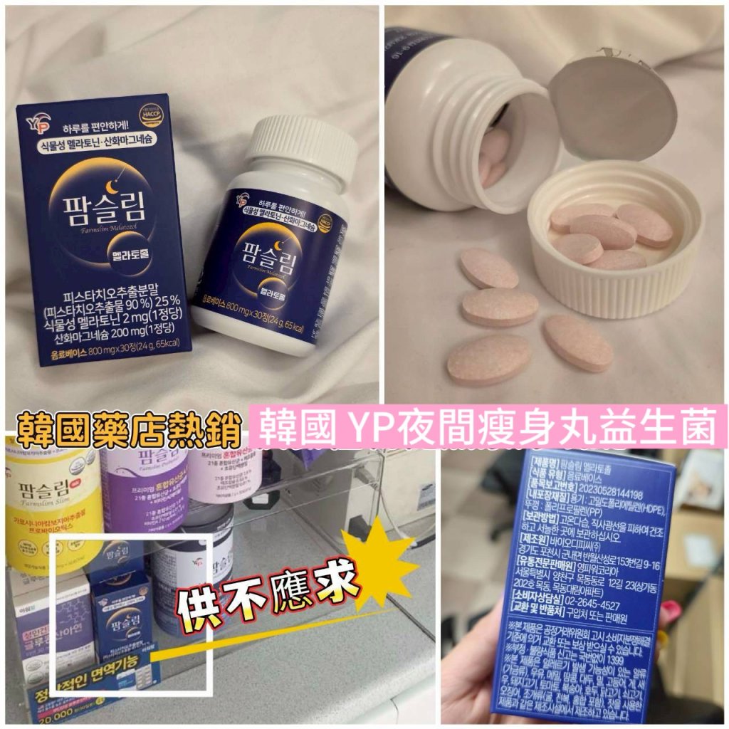 韓國🇰🇷直送✈️YP夜間瘦身丸益生菌(一盒30粒) 🆕🆕YP最新推出方便裝🆕🆕 呢款之前出嘅粉狀益生菌好多客人都非常有效,依家出咗升級版,大家必試❤️🔥❤️🔥 一粒800mg,全面升級🆙🆙🆙 ❤️🔥❤️🔥韓國藥妝店熱銷❤️🔥❤️🔥 YP夜間瘦身丸實際上是指「YP 好夢益生菌」,這是一種韓國製造的三效合一益生菌產品,旨在結合改善睡眠品質、藤黃果提取物促進新陳代謝,以及低分子魚膠原蛋白來輔助瘦身與維持健康。該產品含有多種成分,包括提高睡眠品質、藤黃果提取物以幫助燃燒脂肪,以及幫助延長飽腹感。 產品特色與成分: * 三效合一 :集提升睡眠品質、燃燒腰部脂肪和補充膠原蛋白於一身。 * 改善睡眠品質 :有助於提高睡眠品質。 * 藤黃果提取物 :用於增加新陳代謝,幫助燃燒腰部脂肪。 * 低分子魚膠原蛋白 :有助於維持健康。 * 延長飽腹感 :減少熱量囤積,防止脂肪堆積。 放鬆壓力 療癒疲憊身心靈 🔥促進腸胃道蠕動 啟動代謝 同時好入睡 一覺到天亮 ❗️享廋不必忍受 更能一夜好眠 睡得好 體內循環好 排空阻斷沒問題👌 幫助腸胃道健康 排便順順不卡卡 宿便一掃而空 氣色紅潤青春洋溢